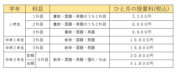 ※ 諸費用として小学生は月額¥1,100(税込)、中学生は月額¥2,200(税込)お支払いいただきます
